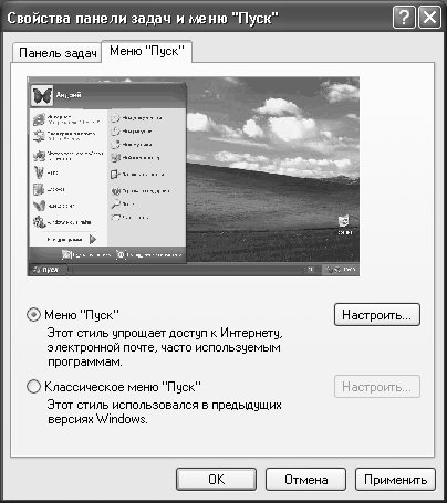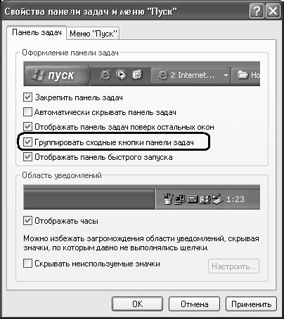 В результате на экране откроется окно Свойства панели задач и меню Пуск, в котором на вкладке Панель задач нужно установить флажок Группировать сходные кнопки панели задач (рис. 2.8) и нажать кнопку Применить либо ОК.