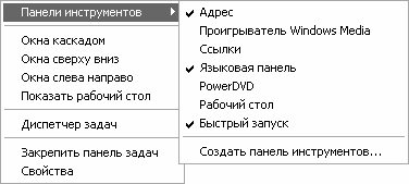 Чтобы открыть контекстное меню панели задач (см. рис. 2.12), нужно щелкнуть на ней правой кнопкой мыши. С некоторыми командами данного меню мы уже познакомились, теперь пора рассмотреть и остальные.