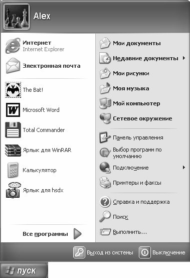 На рис. 2.16 показано меню Пуск в том виде, в котором оно предлагается по умолчанию в Windows XP.
