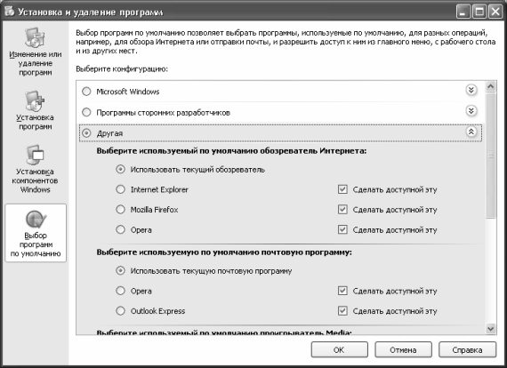 Выбор программ по умолчанию (эта команда может быть также вынесена непосредственно в меню Пуск) – команда предназначена для перехода в режим выбора приложений, используемых по умолчанию для выполнения тех или иных операций. Например, для открытия веб-страниц можно использовать по умолчанию Internet Explorer, а можно – другой обозреватель (например, Mozilla). Для работы с электронной корреспонденцией можно использовать по умолчанию, например, Outlook Express, а можно – The Bat, и т. д. При активизации команды на экране отображается окно Установка и удаление программ с открытым режимом Выбор программ по умолчанию (рис. 2.17).