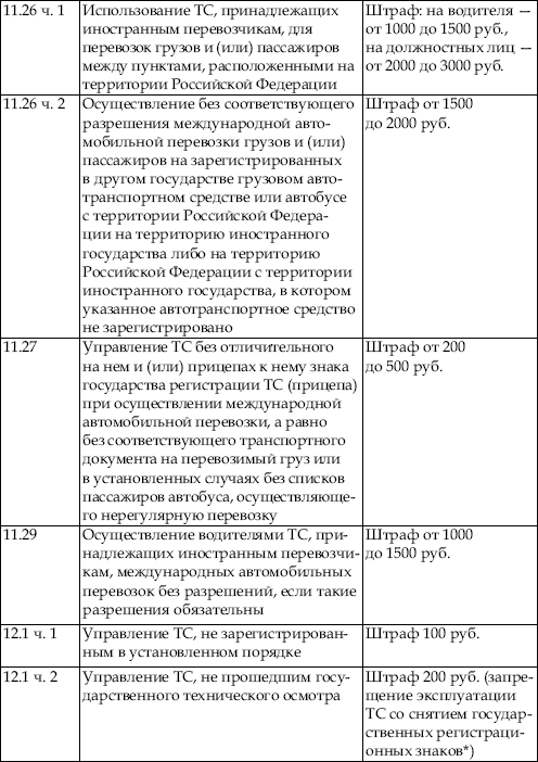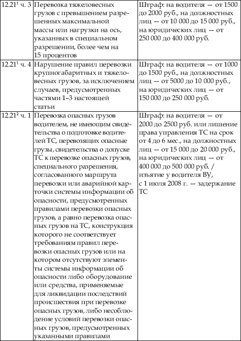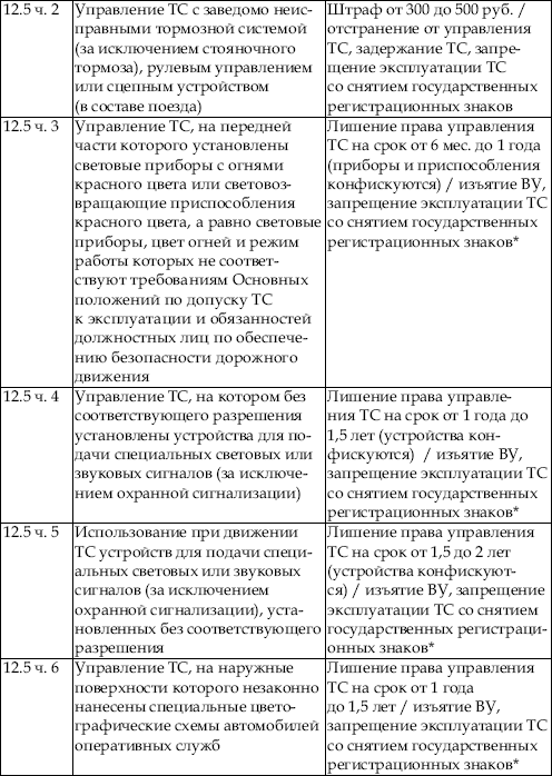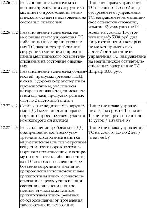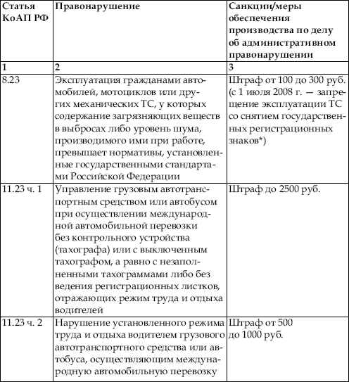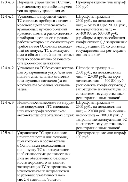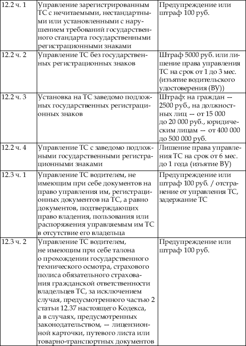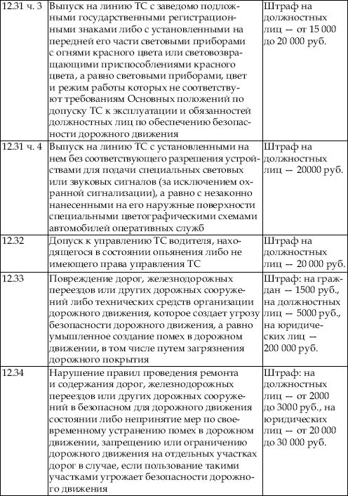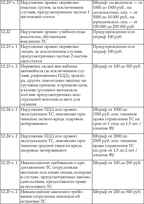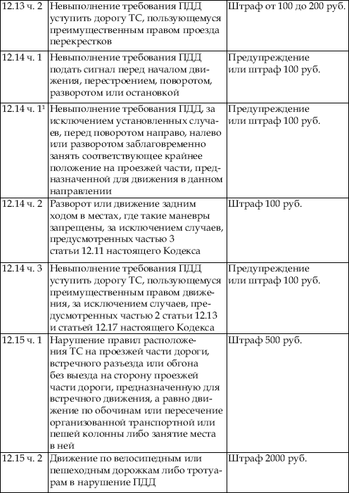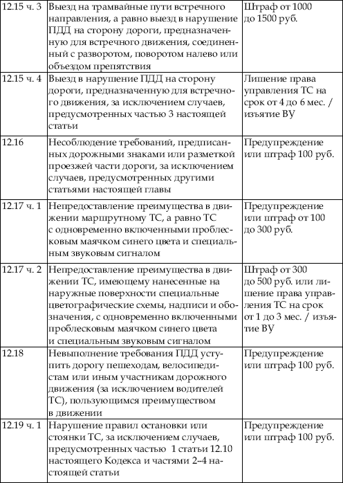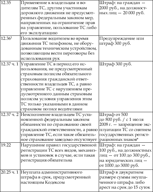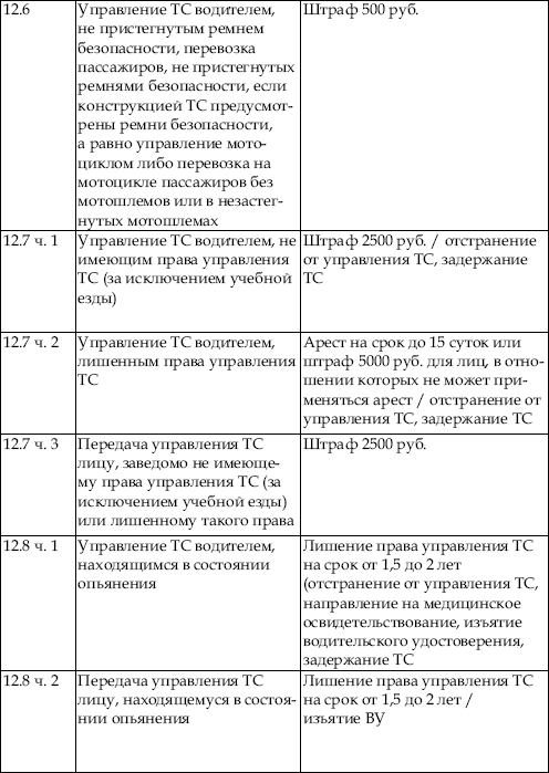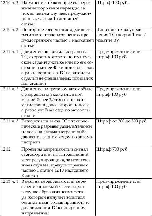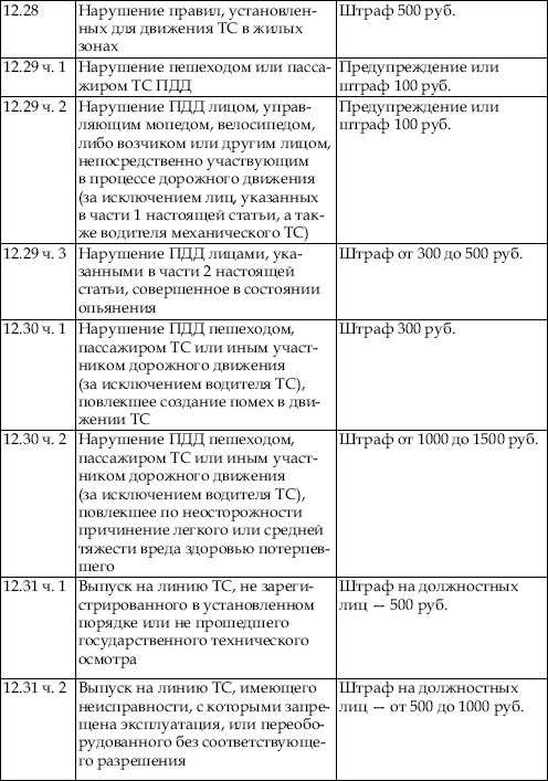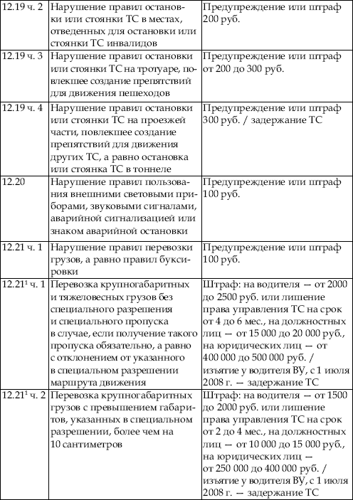 В приведенной ниже таблице содержатся сведения об ответственности за нарушение правил дорожного движения. По сути, данная таблица является выдержкой из Кодекса об административных правонарушениях Российской Федерации с учетом поправок, введенных в действие с 1 января 2008 года.