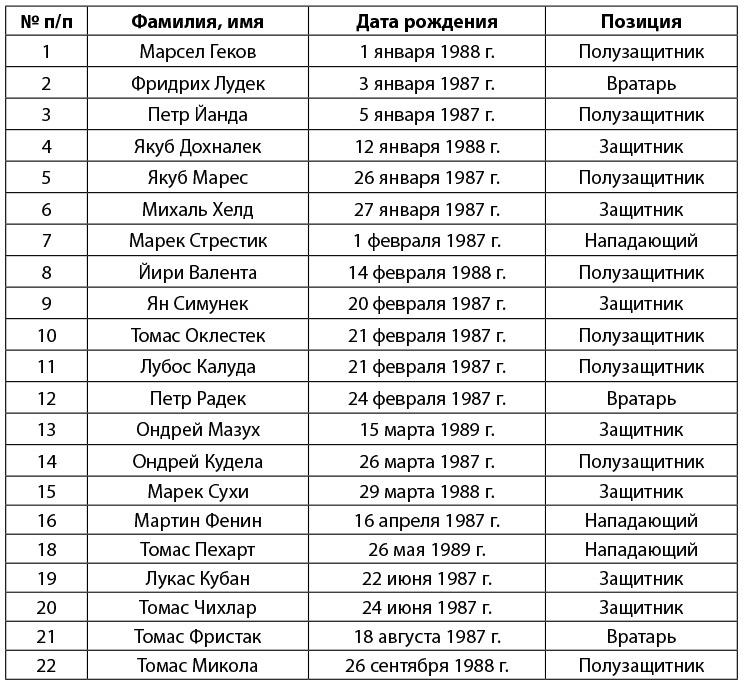 В европейском футболе действуют те же правила, что в канадском хоккее и американском бейсболе: в этом виде спорта распределение также связано с датой рождения. В Англии отбор завершается 1 сентября, поэтому пару лет назад в чемпионате английской Премьер-лиги играли 288 футболистов, родившихся между сентябрем и ноябрем, и только 136 футболистов, родившихся между июнем и августом. В международном футболе завершение отбора раньше приходилось на 1 августа, поэтому на недавно прошедшем юношеском чемпионате 135 игроков родились в первые три месяца после 1 августа и только 22 – в мае, июне и июле. Сегодня эта дата смещена на 1 января. Взгляните на состав юношеской футбольной сборной Чехии, пробившейся в финал чемпионата мира среди юниоров 2007 г.
