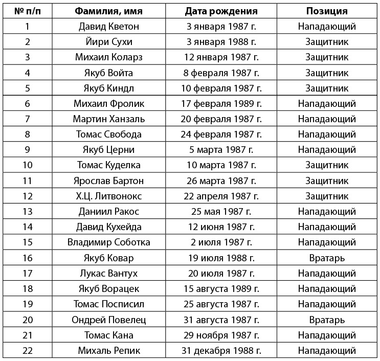 Эффект относительного возраста пугает еще и потому, что система, определяющая, кто получит преимущество, сама по себе несовершенна. Мы полагаем, будто участие в элитных лигах или программах для одаренных детей является гарантом того, что ни один юный талант не просочится сквозь сито отбора. Но взгляните на состав чешской команды еще раз. В нем нет игроков, родившихся в июле, октябре, ноябре и декабре, и только по одному человеку родилось в августе и сентябре. Тех, кто появился на свет во второй половине года, прозевали, проигнорировали или не пропустили в большой спорт. Почти половина талантливых чешских спортсменов осталась невостребованной. Так что же остается делать молодому чеху-спортсмену, если на его долю выпало несчастье родиться во второй половине года? Путь в футбол ему заказан. Расклад не в его пользу. Может быть, ему податься в другой вид спорта, на котором помешаны все чехи, – хоккей? Подождите-подождите. (Уверен, вы догадываетесь, что сейчас последует.) Привожу состав юношеской хоккейной сборной Чехии, занявшей на чемпионате мира 2007 г. пятое место.