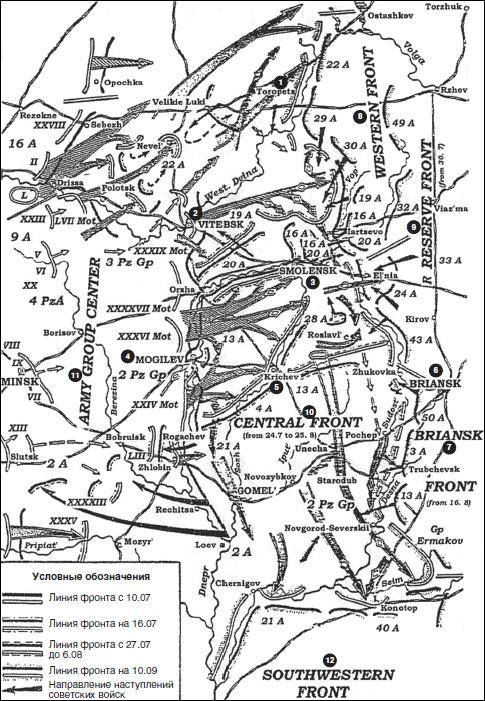 1 – Торопец; 2 – Витебск; 3 – Смоленск; 4 – Могилев; 5 – Кричев; 6 – Брянск; 7 – Брянский фронт; 8 – Западный фронт; 9 – Резервный фронт; 10 – Центральный фронт; 11 – группа армий «Центр»; 12 – Юго-Западный фронт