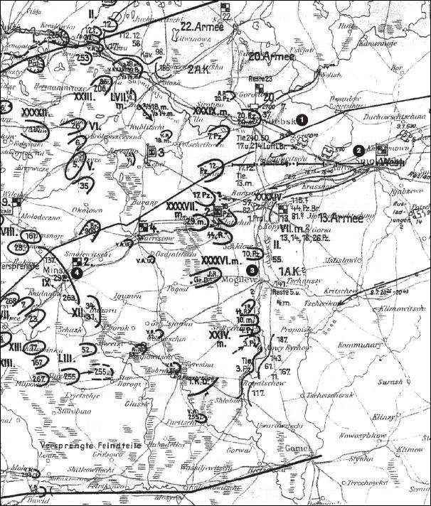 В начале второй недели июля в советских частях, обороняющих Днепр и противостоящих танковой группе Гудериана, царили смятение и замешательство. Первоначально южное крыло 20-й армии Курочкина, противостоящее XXXXVII моторизованному корпусу Лемельзена, обороняло западные подходы к Орше, Копыси и Шклову. Вновь сформированная 13-я армия, которой теперь командовал генерал-лейтенант Ф.Н. Ремизов, сменивший раненого Филатова, дислоцировалась в самом Могилеве и защищала рубеж Днепра от Шклова на юг до Нового Быхова. Ей противостояли части XXXXVI моторизованного корпуса Фитингхофа. Еще дальше к югу 21-я армия Герасименко защищала линию Днепра от Нового Быхова на юг мимо Рогачева, Жлобина и Речица до Гомеля. Против нее действовал XXIV моторизованный корпус Гейера фон Швеппенбурга. Наконец, части 4-й армии, которой теперь командовал Сандалов, проходили переформирование в районе Кричева, вдоль реки Сож в тылу фронта Тимошенко. В то время как все эти войска старались изо всех сил выполнить приказ Тимошенко по удержанию водного рубеж Днепра любой ценой, они также готовились проводить контратаки и контрудары всякий раз, когда это потребуется2.