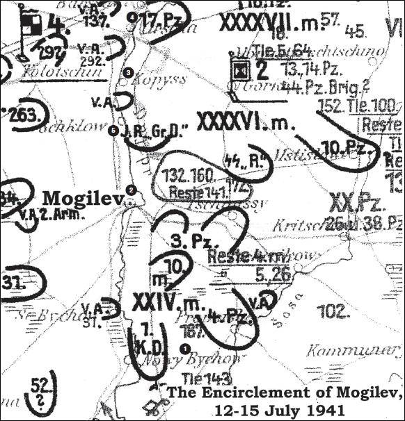 Вечером 12 июля Гудериан развернул три моторизованных корпуса с севера на юг (слева направо) на двух крупных плацдармах на восточном берегу Днепра. На севере XXXXVII моторизованный корпус Лемельзена и XXXXVI корпус Фитингхофа прочно обосновались на участке к востоку от Копыси и Шклова, а их соответствующие 29-я моторизованная и 10-я танковая дивизии в районе Горок были готовы к наступлению в восточном направлении, первая – в направлении Смоленска, а вторая – на Мстиславль на реку Сож. Южнее 4-я танковая и 10-я моторизованная дивизии XXIV моторизованного корпуса Гейера прочно закрепились на Быховском плацдарме к югу от Могилева и были готовы двигаться в восточном направлении к реке Сож на Кричев и Пропойск. Однако наиболее острую проблему для Гудериана представлял город Могилев, расположенный между его двумя плацдармами, который упорно обороняли главные силы 13-й армии Ремизова (впоследствии Герасименко).