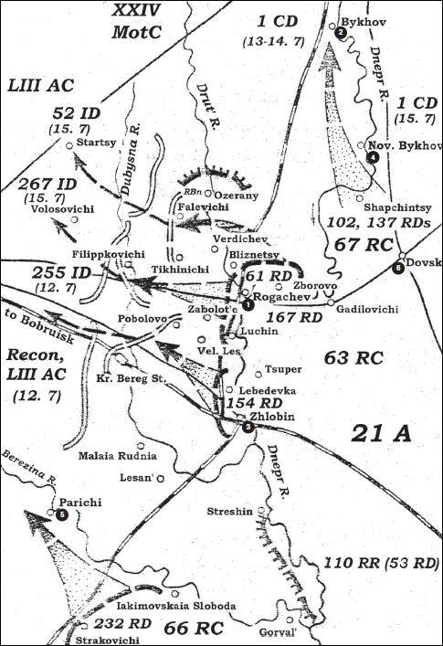 Перейдя в наступление 13 июля, 63-й стрелковый корпус генерал-майора Л.Г. Петровского нанес удар через Днепр и на 8–10 км вклинился в оборону передовых частей 52-й и 255-й дивизий LIII армейского корпуса, захватил Рогачев и Жлобин и оттеснил немцев на запад. Одновременно 67-й стрелковый корпус полковника Ф.Ф. Жмаченко при поддержке 300 танков недавно прибывшего 25-го мехкорпуса генерал-майора С.М. Кривошеина предпринял ряд массированных, но тщетных атак против правого крыла войск Гудериана к югу от Быхова (см. карту 13)57.