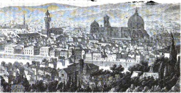 Покатые холмы, окружающие Флоренцию по обеим сторонам реки Арно, с древнейших времен были покрыты более или менее значительными поселениями. С высоты открывался роскошный вид на богатый цветущий город, перерезанный течением реки, с красивыми изогнутыми мостами, прекрасным куполом собора и высокими башнями дворца «Signoria». Кругом, на далеком пространстве, виднелись разбросанные виллы зажиточных людей, из которых одни жили здесь круглый год, а другие проводили только летние месяцы, с своими семьями. Эти мирные жилища представляли резкий контраст с укрепленными замками, раскинутыми на высоте холмов, где все указывало, что они были воздвигнуты с целью защиты против внешних врагов. Большая часть этих зданий, принадлежащих дворянству и знатным могущественным фамилиям города, была окружена рвами, над которыми были устроены крепкие подъемные мосты. В каждом замке содержался более или менее многочисленный отряд вооруженных людей; когда он возвращался из разъезда, то сторож трубил в рог и подъемный мост опускался; то же делалось и в тех случаях, когда господа возвращались с охоты с своей свитой, или кто либо из господ или, гостей выезжал из замка. Высокий нижний этаж этих замков был сооружен из громадных квадратных камней и снабжен небольшими отверстиями, которые служили бойницами, что придавало им вид крепостей.