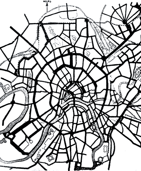 Глядя на план Москвы начала ХХ в., всякий внимательный человек мог сразу заметить, что планировочная структура древней столицы, при ее дальнейшем расширении, должна породить чрезвычайные транспортные проблемы. Сугубо теоретически была возможность наложить на архаическую радиально-кольцевую конструкцию плана ортогональную сетку новых улиц, сохранив элементы давней структуры внутри ее ячеек. В 30-е годы, при строительстве метро, была возможность организовать такую же сеть из путей под землей. Обе возможности были упущены по финансовым и организационным причинам.