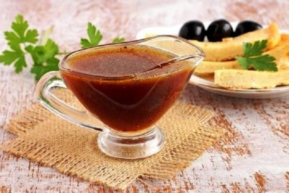 1 tablespoon of rosehip marmalade, 1 teaspoon of flour, 1 teaspoon of butter, 1 teaspoon of honey, 1 tablespoon of wine, 250 ml of meat broth, salt, lemon juice.