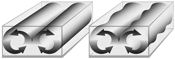 Движение жидкости (или газа). Когда жидкость нагревают снизу, в ней обычно образуются цилиндрические валы (слева). Горячая жидкость поднимается по одной стороне вала, отдает тепло и опускается по противоположной – наблюдается конвекция. Если жидкость нагревать сильнее (справа), возникнет нестабильность, влекущая за собой рябь в валах жидкости, бегущую в двух направлениях по всей длине цилиндров. При дальнейшем повышении температуры поток становится бурным и турбулентным.