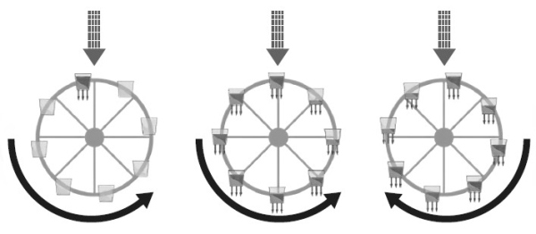 Другой системой, вполне точно описываемой уравнениями Лоренца, является водяное колесо определенного типа, механический аналог вращающихся конвекционных кругов[45]. Вода непрерывно льется с вершины колеса в емкости, закрепленные на его ободе, откуда вытекает дальше через небольшие отверстия. В том случае, когда поток воды мал, верхняя емкость заполняется недостаточно быстро для преодоления трения. Если же скорость водяной струи велика, колесо начинает поворачиваться под весом жидкости. При достаточном напоре колесо станет непрерывно вращаться. При еще большей скорости струи емкости будут успевать заполниться до краев и вода из них не успеет вылиться за время движения вниз. Поднимаясь вверх, своей тяжестью они станут замедлять вращение, в результате колесо может остановиться и начать вращаться в противоположном направлении.