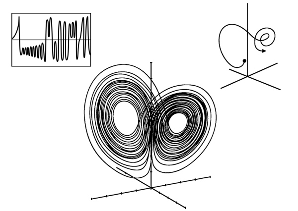 Аттрактор Лоренца. Это магическое изображение (внизу), напоминающее маску совы или крылья бабочки, стало эмблемой первых исследователей хаоса. Оно раскрывает тонкую структуру, таящуюся в беспорядочном потоке информации. Традиционно изменение значений какой-либо переменной графически изображалось в виде так называемого временно́го ряда (вверху). Чтобы продемонстрировать меняющееся соотношение между тремя переменными, потребовался другой способ графического представления. В каждый момент времени три переменных задают положение точки в трехмерном пространстве; по мере изменения системы перемещение точки описывает непрерывное изменение переменных. Поскольку состояние системы никогда точно не повторяется, траектория не пересекает сама себя, образуя лишь новые и новые петли. Движение по аттрактору абстрактно, тем не менее оно передает особенности движения реальных систем. Например, переход от одного из «крыльев» аттрактора к другому соответствует началу обратного хода водяного колеса или изменению направления вращения жидкости при конвекции.