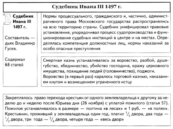 1497 – составление «Судебника» Ивана III, что привело к широкомасштабному процессу закрепощения крестьянства. Устанавливается Юрьев День (26 ноября), согласно которому крестьяне могли осуществлять переход к новому владельцу только неделя до и после 26 ноября. При всём этом крестьянин должен был выплатить пожилое. Пожилое – это плата за пользование землёй феодала, например, плата за местность, которая была удалена от леса составляла 1 рубль.