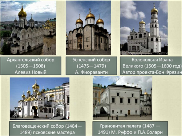 1505 – итальянский архитектор Алевиз Новый начинает строительство Архангельского собора в Московском Кремле (усыпальница русских князей и царей). В этом же году другой итальянский архитектор – Бон Фрязин начинает строительство церкви Иоанна Лествичника с колокольный («Колокольня Ивана Великого»). Строительство обоих зданий будет закончено уже при сыне Ивана III – Василии III.