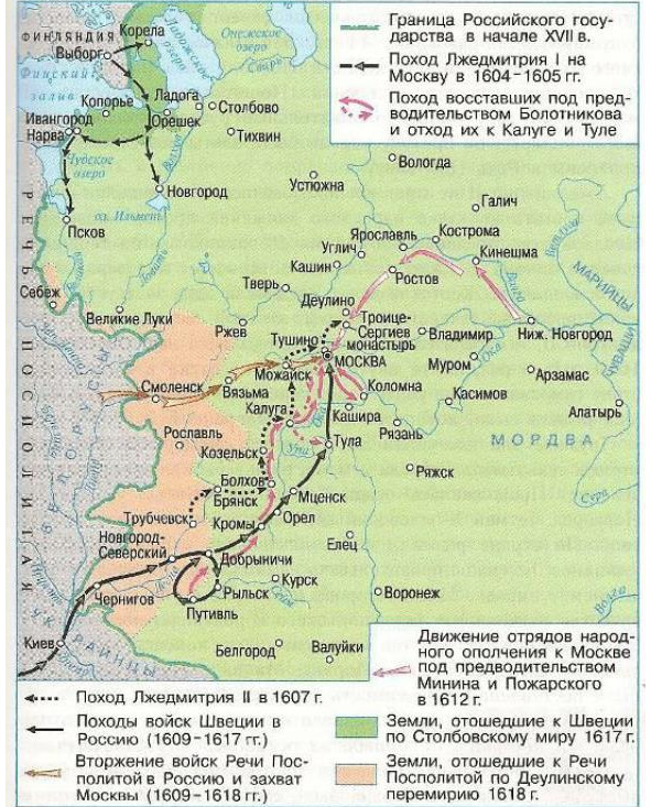 1617 – подписан Столбовский мирный договор с Швецией (деревня Столбово находится в современной Ленинградской области), который положил конец русско-шведской войне 1610—1617 гг. Согласно установленным границам, которые сохранились до Северной войны 1700—1721 гг. Москва возвращала обратно себе существенные территории, которые ранее завоевала Швеция: Новгород, Порхов и Гдов (ныне Псковская область), Старую Руссу (Ныне Новгородская область), Ладогу (ныне Ленинградская область).