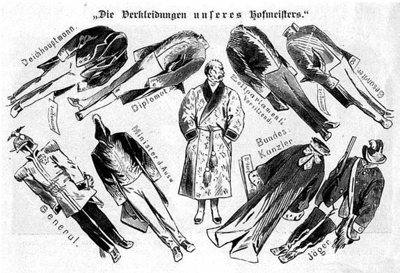 Карикатура на Бисмарка. У него есть мундир на каждый случай, поскольку он мастер на все политические руки: он и дипломат, и канцлер, и генерал