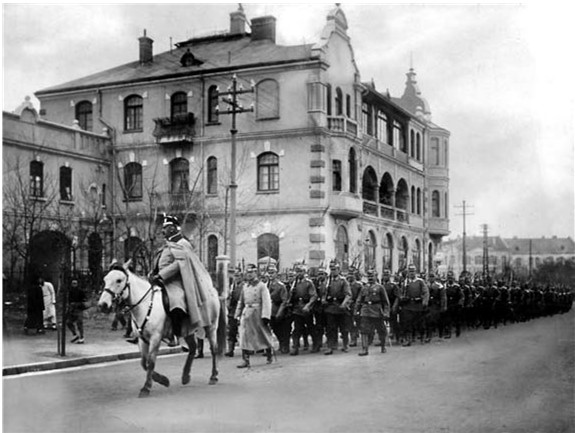 Немецкие солдаты на улицах г. Циндао, Китай. Японская армия и флот за два месяца отобрали у Германии все ее китайские владения