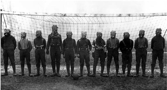 Британская армейская футбольная команда на фронте в противогазах. 1916 г.