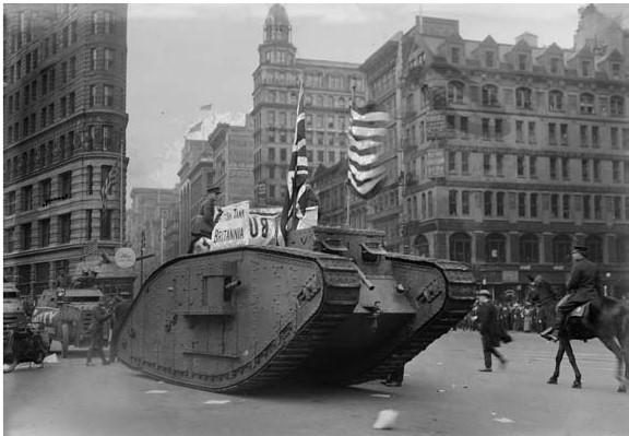 Первый британский танк Mark IV на параде в Нью-Йорке, 1917 г. Англичане намеревались переломить с помощью танков ход войны. Через четверть века такая же мысль придет и Гитлеру
