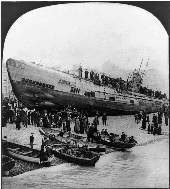 Немецкая подлодка, выброшенная на британский берег. Хотя философом неограниченной подводной войны считался адмирал Тирпиц, устроенная фельдмаршалом Гинденбургом тотальная подводная война повергла в состояние шока даже его