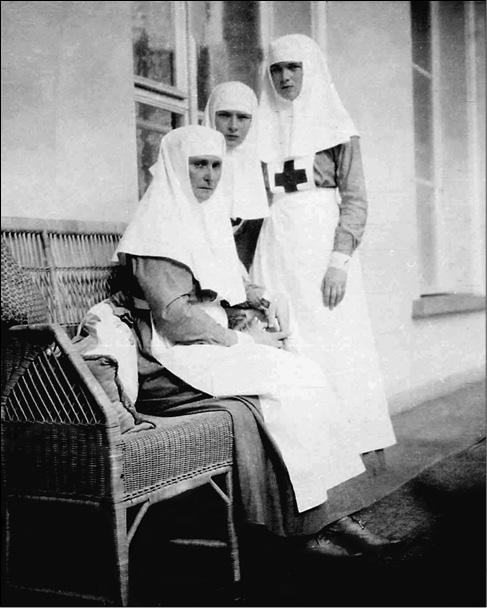 Императрица Александра Федоровна и великие княжны Ольга и Татьяна в форме сестер милосердия. 1910-е гг.