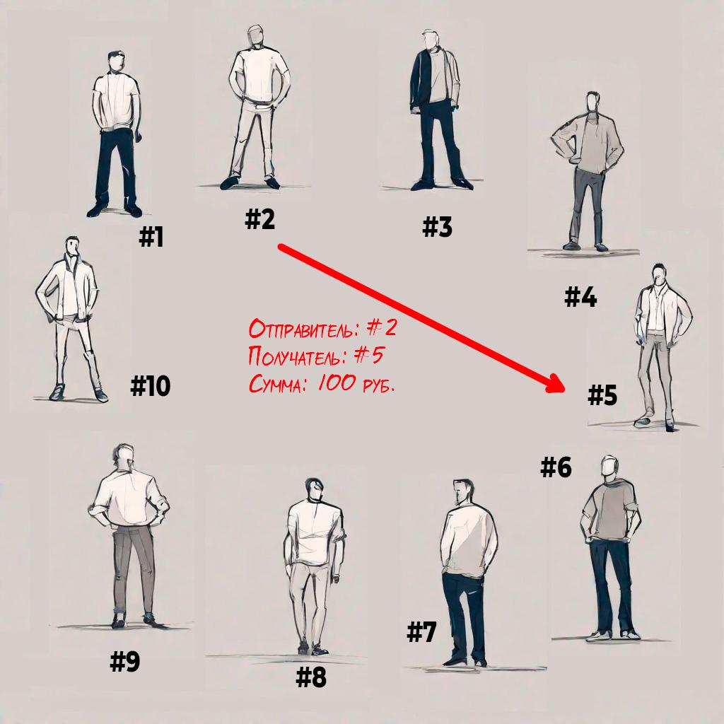 ШАГ 2: ТРАНЗАКЦИИ.Каждый сидит с пустым листом и ручкой в руке и готов записать любую транзакцию, которая произойдет внутри этой системы. И вот 1 марта 2023 года в 10:00 утра Участник #2 решает отправить участнику #5 100 рублей. Он сообщает всем об этом. А мы помним, что все знают сколько у кого есть денег на счету.