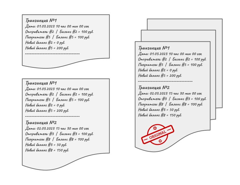 У каждого нашего пользователя есть огромная папка, в которой лежат страницы с записями о каких-то событиях (в нашем примере о платежах). Очень важно, что данную папку не контролирует кто-то конкретный. Это означает, что никто не может подменить страницы или исправить информацию на какой-то странице и при этом каждый может посмотреть записи в папке другого участника и может добавить в папку информацию если с этим согласны все остальные.
