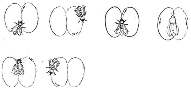 Виляющий танец. Пчела пробегает по рамке небольшой полукруг, делает поворот, бежит по прямой к исходному пункту. Затем описывает второй полукруг в другую сторону, т. е. делает два овальных круга, напоминающих восьмерку. При этом пчела во время танца еще делает быстрые виляющие движения брюшком. Такие танцы, несомненно, рассказывают другим пчелам о направлении и расстоянии до источника взятка или пыльцы. Чем дольше длится танец и чем больше прямые пробеги пчелы, тем дальше находится источник. Если пчела бежит вверх по соту, значит, источник находится по направлению к солнцу; если вниз – значит, источник корма – в противоположном от солнца направлении. Если корм находится вправо от солнца, танец пчелы отклоняется вправо. Если пробеги пчела совершает влево, значит, корм находится влево от солнца.