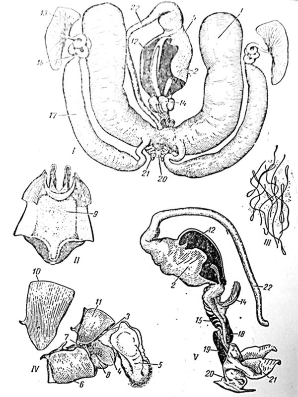 I – половые органы трутня со спиной стороны; II – спинная стенка полового члена с внутренней стороны; III – группа сперматозоидов; IV – концевые брюшные сегменты трутня (вид сбоку), половой член слегка выпячен; V – половой член и семяизвергательный канал (вид сбоку). 1 – придаточная слизистая железа; 2 – луковица полового члена; 3, 4 – захватывающие органы 9-го брюшного полукольца; 5 – половой член; 6, 7, 8 – 8-е и 9-е брюшные полукольца; 9 – студенистая масса на внутренней стенке луковицы полового члена; 10, 11 – 7-е и 8-е спинные полукольца; 12 – верхние пластинки луковицы полового члена; 13 – семенник; 14 – бахромчатые доли у основания луковицы полового члена; 16 – выносящий семяпроток; 17 – семенной пузырек; 18, 19 – верхние и нижние пластинки в стенке полового члена; 20 – концевая камера полового члена; 21 – совокупительные мешочки полового члена; 22 – семяизвергательный канал.