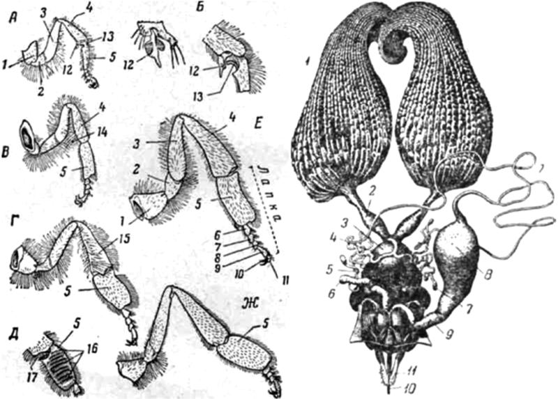 Ножки пчелы (слева): А – передняя ножка рабочей пчелы; Б – приспособления для чистки усиков; В – средняя ножка рабочей пчелы; Г – задняя ножка рабочей пчелы (вид спереди); Д – первый членик лапки задней ножки со щеточкой для сбора пыльцы; Е – задняя ножка матки; Ж – задняя ножка трутня. 1 – тазик (ляжка); 2 – вертлуг; 3 – бедро; 4 – голень; 5–9 – первый, второй, третий, четвертый, пятый членики лапки; 10 – коготки; Л – подушечка; 12 – клапан; 13 – вырезка для чистки усиков; 14 – шпорце; 15 – корзиночка для сбора обножки; 16 – щеточка; 17 – пыльцевой гребешок. Половые органы матки (справа): 1 – яичники; 2 – парные яйцеводы; 3 – семяприемник; 4 – придаточная железа семяприемника; 5 – влагалище; 6 – малая ядовитая железа; 7, 8, 9 – большая ядовитая железа; 10 и 11 – жало.