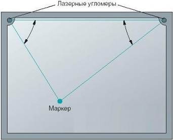 В интерактивных досках лазерной технологии используются два инфракрасных лазерных угломера. Как правило, лазерные угломеры размещаются по углам в верхней части доски. Зеркало угломера вращается с постоянной угловой скоростью. Инфракрасный луч угломера сканирует поверхность доски, переходя из одной ее точки к другой. Лучи инфракрасных лазеров отражаются от «воротничка» маркера и регистрируются фотодатчиками. Система запоминает угол поворота зеркала в момент фиксации отраженного блика. Затем на основании расстояния между угломерами и значений углов встроенный микропроцессор вычисляет координаты кончика пера. Для работы с лазерной интерактивной доской требуется использовать специальный маркер.