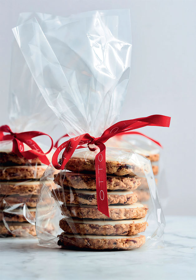 В этом печенье есть все, чтобы порадовать каждое из пяти чувств: горчинка клюквы, приятная текстура овсяных хлопьев, ореховые нотки цельнозерновой муки и миндаля и роскошная сладость белой шоколадной глазури. Вместо клюквы можно взять вишню или мясистую калифорнийскую черешню.