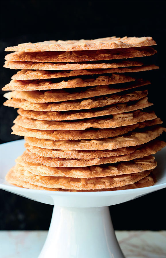 По традиции тюили остужают, выложив на скалку, чтобы они приобрели характерную изогнутую форму. Мы предпочитаем плоские – так они лучше хранятся и реже ломаются, – но вы можете следовать традиции, если пожелаете.