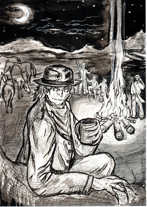 Ночь легла на прерию – темно-синяя, чернильная, глухая. Джейк и не думал, что в самом деле летней ночью может быть настолько темно. Густую бархатную черноту едва разбавлял рыжий свет костра, слегка оттеснял от стоянки, от собравшихся вокруг огня людей… и все. Сделаешь шаг в сторону – утонешь в этой тьме. В городе – да даже и на ранчо! – свет из окон домов и над крыльцом казался куда как более надежным, ярким и сильным, чем одинокий костер посреди ночной прерии. Да, их костер горел ровно – пастухи то и дело подбрасывали в него веток и сухой травы, заботясь и о свете, и о тепле: после знойного дня ночная прохлада зябкими пальцами лезла под одежду, неприятно щекотала шею и заставляла кутаться в куртки и пончо. Джейк пожалел, что не захватил куртку – но Диего принес откуда-то еще одно пончо, набросил друзьям на плечи, сразу обоим; потрепал лобастую голову пса – и Корки лишь вяло лизнул ладонь парня, разочарованно вздохнув: угощения в ней не нашлось. Джейк фыркнул, подумав, что скверная репутация Корки явно преувеличена, с такими-то манерами!