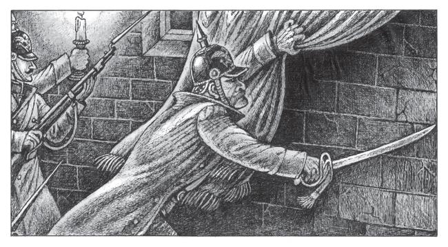 Обыск продолжался долго, и прошло много времени, прежде нежели капитан Баумгартен удостоверился в справедливости слов дворецкого. Трудно было осматривать этот дом. Узкие крутые лестницы, по которым нельзя было идти двоим в ряд, перемежались темными, извилистыми коридорами. Стены были так толсты, что звуков в соседней комнате совсем не было слышно. Капитан Баумгартен топал ногами, срывал занавеси, тыкал саблей в углы, надеясь найти потайные места, но эти поиски не привели ни к каким результатам.