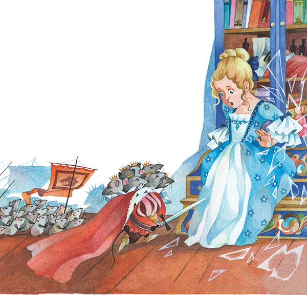 – О государь, неужели вы, весь израненный, намерены подвергнуть себя опасностям битвы? Посмотрите на ваших храбрых подданных: они уверены в победе. Полицейские, паяц, трубочисты, музыканты и барабанщик уже внизу, и сахарные куклы с моей полки тоже готовы к битве. Вы же отдохните в моих объятиях или, если хотите, полюбуйтесь победой с высоты моей шляпы со страусовыми перьями!