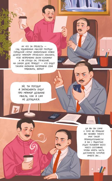 Весь следующий день посвящен был визитам; приезжий отправился делать визиты всем городским сановникам. Был с почтением у губернатора, который, как оказалось, подобно Чичикову был ни толст, ни тонок собой, имел на шее Анну, и поговаривали даже, что был представлен к звезде; впрочем, был большой добряк и даже сам вышивал иногда по тюлю. Потом отправился к вице-губернатору, потом был у прокурора, у председателя палаты, у полицеймейстера, у откупщика, у начальника над казенными фабриками… жаль, что несколько трудно упомнить всех сильных мира сего; но довольно сказать, что приезжий оказал необыкновенную деятельность насчет визитов: он явился даже засвидетельствовать почтение инспектору врачебной управы и городскому архитектору. И потом еще долго сидел в бричке, придумывая, кому бы еще отдать визит, да уж больше в городе не нашлось чиновников. В разговорах с сими властителями он очень искусно умел польстить каждому. Губернатору намекнул как-то вскользь, что в его губернию въезжаешь как в рай, дороги везде бархатные, и что те правительства, которые назначают мудрых сановников, достойны большой похвалы. Полицеймейстеру сказал что-то очень лестное насчет городских будочников; а в разговорах с вице-губернатором и председателем палаты, которые были еще только статские советники, сказал даже ошибкою два раза: «ваше превосходительство», что очень им понравилось. Следствием этого было то, что губернатор сделал ему приглашение пожаловать к нему того же дня на домашнюю вечеринку, прочие чиновники тоже, с своей стороны, кто на обед, кто на бостончик, кто на чашку чаю.