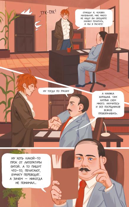 Пока приезжий господин осматривал свою комнату, внесены были его пожитки: прежде всего чемодан из белой кожи, несколько поистасканный, показывавший, что был не в первый раз в дороге. Чемодан внесли кучер Селифан, низенький человек в тулупчике, и лакей Петрушка, малый лет тридцати, в просторном подержанном сюртуке, как видно с барского плеча, малый немного суровый на взгляд, с очень крупными губами и носом. Вслед за чемоданом внесен был небольшой ларчик красного дерева с штучными выкладками из карельской березы, сапожные колодки и завернутая в синюю бумагу жареная курица. Когда все это было внесено, кучер Селифан отправился на конюшню возиться около лошадей, а лакей Петрушка стал устраиваться в маленькой передней, очень темной конурке, куда уже успел притащить свою шинель и вместе с нею какой-то свой собственный запах, который был сообщен и принесенному вслед за тем мешку с разным лакейским туалетом. В этой конурке он приладил к стене узенькую трехногую кровать, накрыв ее небольшим подобием тюфяка, убитым и плоским, как блин, и, может быть, так же замаслившимся, как блин, который удалось ему вытребовать у хозяина гостиницы.