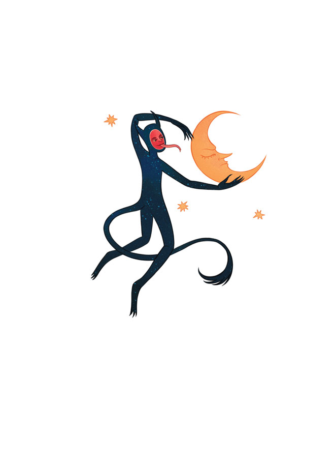Если бы в это время проезжал сорочинский заседатель на тройке обывательских лошадей, в шапке с барашковым околышком, сделанной по манеру уланскому, в синем тулупе, подбитом черными смушками[2], с дьявольски сплетенною плетью, которою имеет он обыкновение подгонять своего ямщика, то он бы, верно, приметил ее, потому что от сорочинского заседателя ни одна ведьма на свете не ускользнет. Он знает наперечет, сколько у каждой бабы свинья мечет поросенков, и сколько в сундуке лежит полотна, и что именно из своего платья и хозяйства заложит добрый человек в воскресный день в шинке. Но сорочинский заседатель не проезжал, да и какое ему дело до чужих, у него своя волость. А ведьма между тем поднялась так высоко, что одним только черным пятнышком мелькала вверху. Но где ни показывалось пятнышко, там звезды, одна за другою, пропадали на небе. Скоро ведьма набрала их полный рукав. Три или четыре еще блестели. Вдруг, с другой стороны, показалось другое пятнышко, увеличилось, стало растягиваться, и уже было не пятнышко. Близорукий, хотя бы надел на нос вместо очков колеса с комиссаровой брички, и тогда бы не распознал, что это такое. Спереди совершенно немец[3]: узенькая, беспрестанно вертевшаяся и нюхавшая все, что ни попадалось, мордочка оканчивалась, как и у наших свиней, кругленьким пятачком, ноги были так тонки, что если бы такие имел яресковский голова, то он переломал бы их в первом козачке[4]. Но зато сзади он был настоящий губернский стряпчий в мундире, потому что у него висел хвост, такой острый и длинный, как теперешние мундирные фалды; только разве по козлиной бороде под мордой, по небольшим рожкам, торчавшим на голове, и что весь был не белее трубочиста, можно было догадаться, что он не немец и не губернский стряпчий, а просто черт, которому последняя ночь осталась шататься по белому свету и выучивать грехам добрых людей. Завтра же, с первыми колоколами к заутрене, побежит он без оглядки, поджавши хвост, в свою берлогу. Между тем черт крался потихоньку к месяцу и уже протянул было руку схватить его, но вдруг отдернул ее назад, как бы обжегшись, пососал пальцы, заболтал ногою и забежал с другой стороны, и снова отскочил и отдернул руку. Однако ж, несмотря на все неудачи, хитрый черт не оставил своих проказ. Подбежавши, вдруг схватил он обеими руками месяц, кривляясь и дуя, перекидывал его из одной руки в другую, как мужик, доставший голыми руками огонь для своей люльки[5]; наконец поспешно спрятал в карман и, как будто ни в чем не бывало, побежал далее. В Диканьке никто не слышал, как черт украл месяц. Правда, волостной писарь, выходя на четвереньках из шинка, видел, что месяц ни с сего ни с того танцевал на небе, и уверял с божбою в том все село; но миряне качали головами и даже подымали его на смех. Но какая же была причина решиться черту на такое беззаконное дело? А вот какая: он знал, что богатый козак Чуб приглашен дьяком на кутью, где будут: голова; приехавший из архиерейской певческой родич дьяка в синем сюртуке, бравший самого низкого баса; козак Свербыгуз и еще кое-кто; где, кроме кутьи, будет варенуха, перегонная на шафран водка и много всякого съестного. А между тем его дочка, красавица на всем селе, останется дома, а к дочке наверное придет кузнец, силач и детина хоть куда, который черту был противнее проповедей отца Кондрата. В досужее от дел время кузнец за