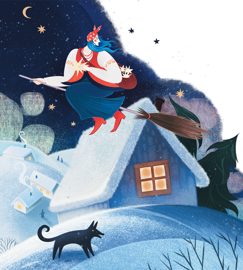 Последний день перед Рождеством прошел. Зимняя, ясная ночь наступила. Глянули звезды. Месяц величаво поднялся на небо посветить добрым людям и всему миру, чтобы всем было весело колядовать и славить Христа[1]. Морозило сильнее, чем с утра; но зато так было тихо, что скрып мороза под сапогом слышался за полверсты. Еще ни одна толпа парубков не показывалась под окнами хат; месяц один только заглядывал в них украдкою, как бы вызывая принаряживавшихся девушек выбежать скорее на скрыпучий снег. Тут через трубу одной хаты клубами повалился дым и пошел тучею по небу, и вместе с дымом поднялась ведьма верхом на метле.
