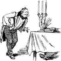 Слова хозяйки были прерваны странным шипением, так что гость было испугался; шум походил на то, как бы вся комната наполнилась змеями; но, взглянувши вверх, он успокоился, ибо смекнул, что стенным часам пришла охота бить. За шипеньем тотчас же последовало хрипенье, и, наконец, понатужась всеми силами, они пробили два часа так им звуком, как бы кто колотил палкой по разбитому горшку, после чего маятник пошел опять покойно щелкать направо и налево.