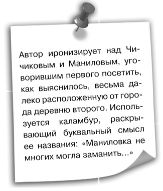 Фамилия Манилов связана с манить – «звать, привлекать, прельщать». Диалектное слово мана – мираж. Герой производит приятное впечатление, но потом вызывает скуку. Манилов занят глупыми и нереализуемыми мечтами. На это указывает слово маниловщина – «мечтательно-бездеятельное отношение к окружающему, беспочвенное благодушие». Сравним его со словом обломовщина из романа И. А. Гончарова «Обломов». Характерная оговорка Чичикова, назвавшего деревню Манилова не Маниловкой, а несуществующим названием – Заманиловкой. Оно образовано от глагола совершенного вида заманить, то есть «завлечь какой-нибудь приманкой; обманом завлечь в засаду, в сети». Чичиков плетет интриги, заманивает своим необычным предложением, но и сам находится под воздействием своей страсти, созданного его воображением миража.