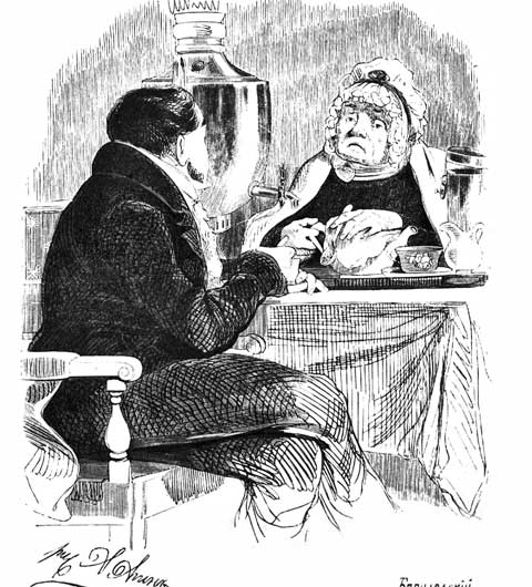 «У вас, матушка, блинцы очень вкусны», сказал Чичиков, принимаясь за принесенные горячие.