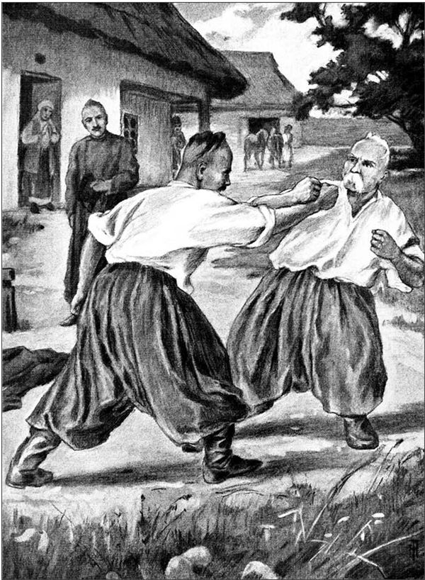 И отец с сыном, вместо приветствия после давней отлучки, начали насаживать друг другу тумаки и в бока, и в поясницу, и в грудь, то отступая и оглядываясь, то вновь наступая.