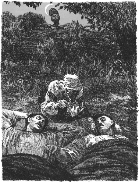 Месяц с вышины неба давно уже озарял весь двор, наполненный спящими, густую кучу верб и высокий бурьян, в котором потонул частокол, окружавший двор. Она все сидела в головах милых сыновей своих, ни на минуту не сводила с них глаз и не думала о сне. Уже кони, чуя рассвет, все полегли на траву и перестали есть; верхние листья верб начали лепетать, и мало-помалу лепечущая струя спустилась по ним до самого низу. Она просидела до света, вовсе не утомилась и внутренне желала, чтобы ночь протянулась как можно дольше. Со степи понеслось звонкое ржание жеребенка; красные полосы ясно сверкнули на небе.