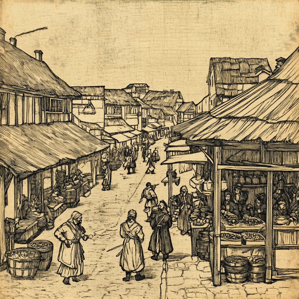 В самом деле, это была картина довольно смелая: запорожец как лев растянулся на дороге. Закинутый гордо чуб его захватывал на пол-аршина земли. Шаровары алого дорогого сукна были запачканы дегтем для показания полного к ним презрения. Полюбовавшись, Бульба пробирался далее по тесной улице, которая была загромождена мастеровыми, тут же отправлявшими ремесло свое, и людьми всех наций, наполнявшими это предместие Сечи, которое было похоже на ярмарку и которое одевало и кормило Сечь, умевшую только гулять да палить из ружей.