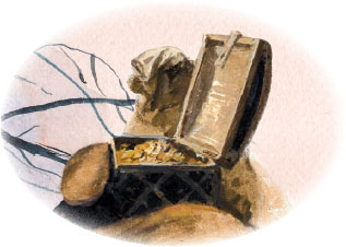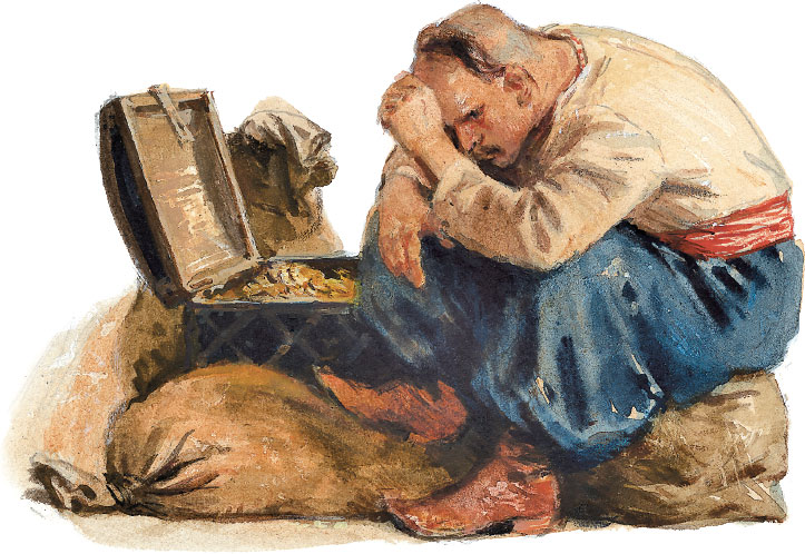 Два дни и две ночи спал Петро без просыпу. Очнувшись на третий день, долго осматривал он углы своей хаты; но напрасно старался что-нибудь припомнить: память его была как карман старого скряги, из которого полушки не выманишь. Потянувшись немного, услышал он, что в ногах брякнуло. Смотрит: два мешка с золотом. Тут только, будто сквозь сон, вспомнил он, что искал какого-то клада, что было ему одному страшно в лесу… Но за какую цену, как достался он, этого никаким образом не мог понять.