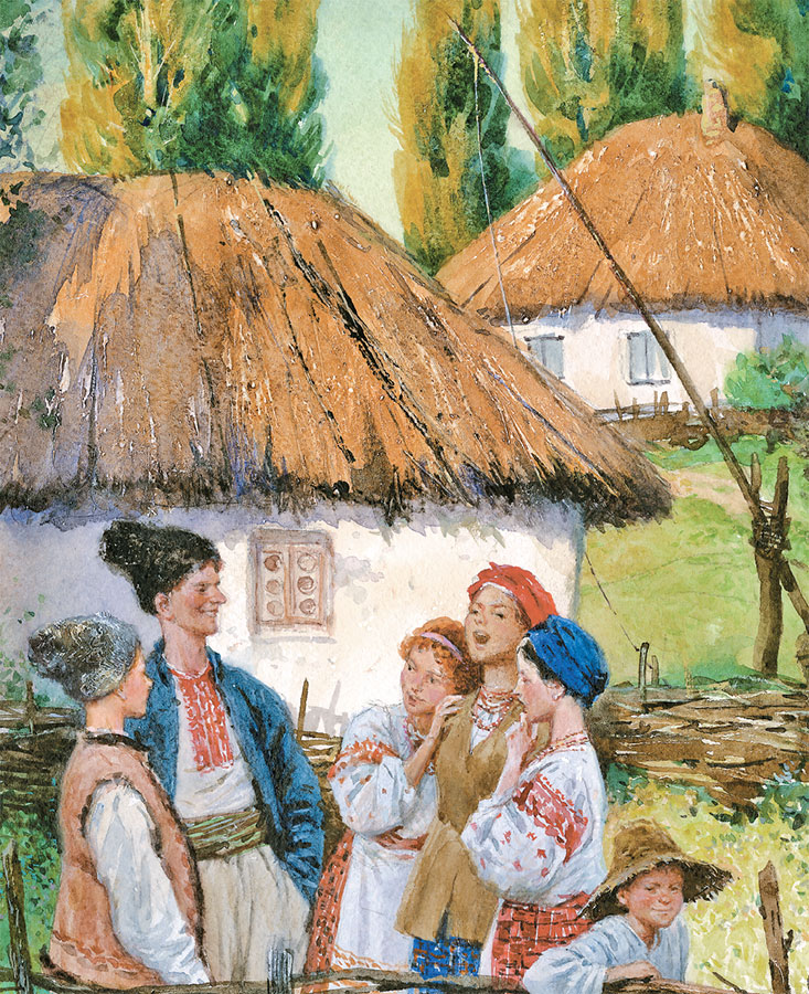 – О, не дрожи, моя красная калиночка! Прижмись ко мне покрепче! – говорил парубок, обнимая ее, отбросив бандуру, висевшую на длинном ремне у него на шее, и садясь вместе с нею у дверей хаты. – Ты знаешь, что мне и часу не видать тебя горько.