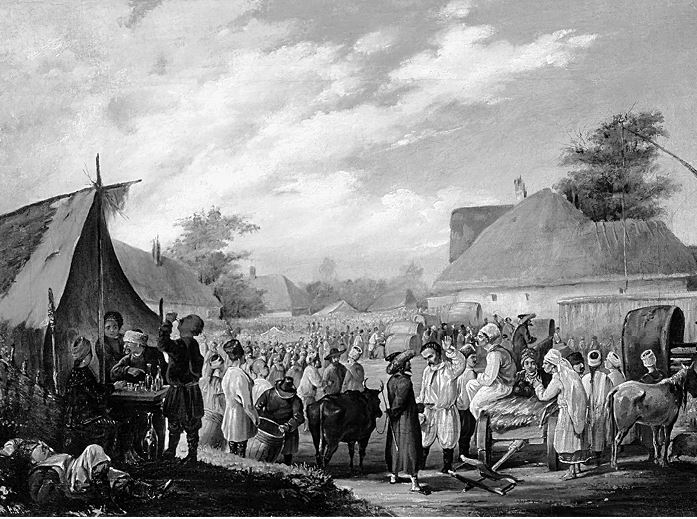 Из малороссийской комедииВам, верно, случалось слышать где-то валящийся отдаленный водопад, когда встревоженная окрестность полна гула и хаос чудных неясных звуков вихрем носится перед вами. Не правда ли, не те ли самые чувства мгновенно обхватят вас в вихре сельской ярмарки, когда весь народ срастается в одно огромное чудовище и шевелится всем своим туловищем на площади и по тесным улицам, кричит, гогочет, гремит? Шум, брань, мычание, блеяние, рев – все сливается в один нестройный говор. Волы, мешки, сено, цыганы, горшки, бабы, пряники, шапки – все ярко, пестро, нестройно; мечется кучами и снуется перед глазами. Разноголосные речи потопляют друг друга, и ни одно слово не выхватится, не спасется от этого потопа; ни один крик не выговорится ясно. Только хлопанье по рукам торгашей слышится со всех сторон ярмарки. Ломается воз, звенит железо, гремят сбрасываемые на землю доски, и закружившаяся голова недоумевает, куда обратиться. Приезжий мужик наш с чернобровою дочкой давно уже толкался в народе. Подходил к одному возу, щупал другой, применивался к ценам; а между тем мысли его ворочались безостановочно около десяти мешков пшеницы и старой кобылы, привезенных им на продажу. По лицу его дочки заметно было, что ей не слишком приятно тереться около возов с мукою и пшеницею. Ей бы хотелось туда, где под полотняными ятками* нарядно развешаны красные ленты, серьги, оловянные, медные кресты и дукаты*. Но и тут, однако ж, она находила себе много предметов для наблюдения: ее смешило до крайности, как цыган и мужик били один другого по рукам, вскрикивая сами от боли; как пьяный жид давал бабе киселя*; как поссорившиеся перекупки перекидывались бранью и раками; как москаль*, поглаживая одною рукою свою козлиную бороду, другою… Но вот почувствовала она, кто-то дернул ее за шитый рукав сорочки. Оглянулась – и парубок в белой свитке, с яркими очами стоял перед нею. Жилки ее вздрогнули, и сердце забилось так, как еще никогда, ни при какой радости, ни при каком горе: и чудно и любо ей показалось, и сама не могла растолковать, что делалось с нею.
